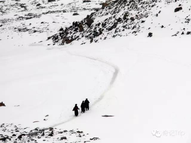 和伟简一番握别,出哲热普寺,便是开阔的卓玛曲河谷。河谷覆满冰渍,雪果然积得挺深,走在上面咯吱作响,不一会鞋面已满是雪沫。才出河谷,迎面便是一道很陡的坡路。这乱石积雪的山坡,高差在内陆也许不值一提。但在这海拔5200米地带,每上升100米都是对意志的严重考验。越来越稀薄的氧气,足以让人胸腔钝痛到如同身在地狱。于是,人们给通往卓玛拉山口的四道陡坡,冠以了一个意味深长的名字:“地狱坡”。