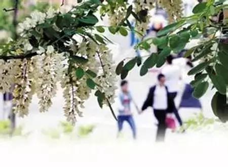 五月槐花盛开之时,蝶形花冠,成簇的垂悬下来,整条大道都散发着淡淡的芬芳。