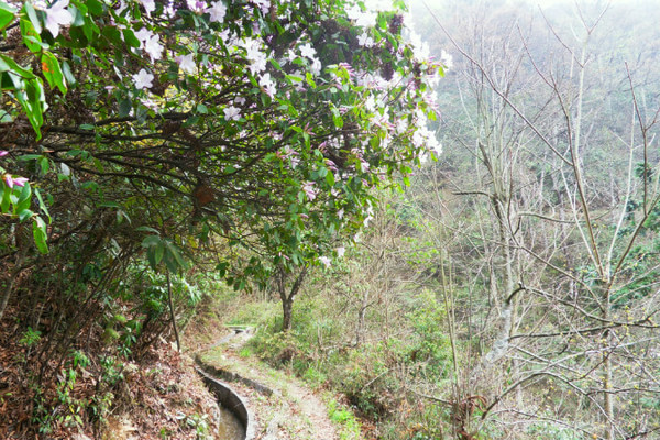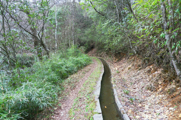 沿着路继续上行,道路会跟一条水渠汇合,道路开始变的平缓,沿着山腰行进。右侧是山谷,左侧是山峰。