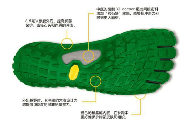 VFF的核心理念是赤足,鞋底主体是一层橡胶,中底部分还加了一层3D Cocoon,当你踩到石块时,可以分散压力。
