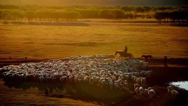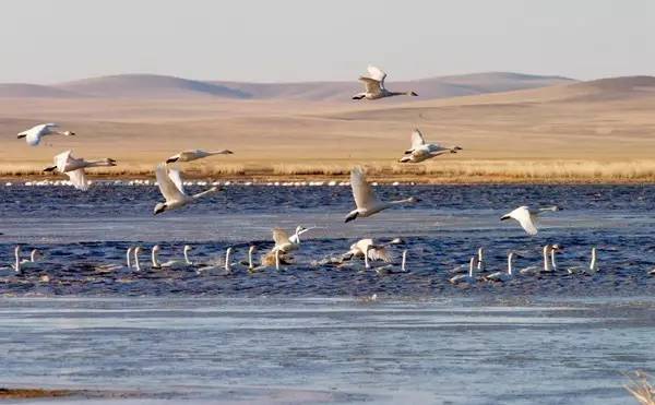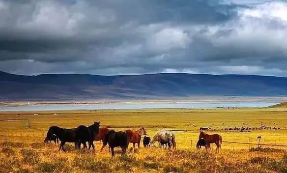一群群棕色的马、黑色的牛、白色的羊,零零散散的,悠闲自在......偶尔惊起一群或一只大雁、野鸭从湖泊中草丛中飞起,蜿蜒辗转,飞往另一个地方。
