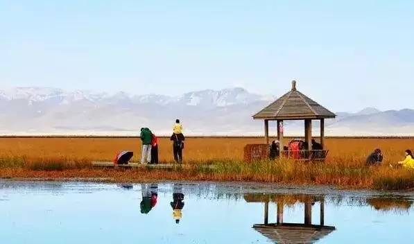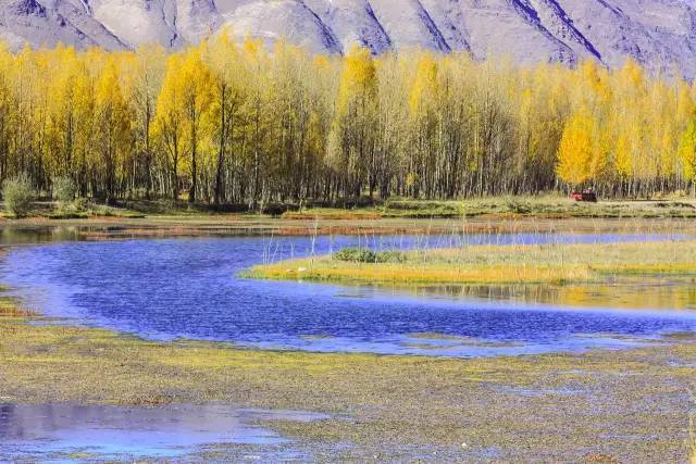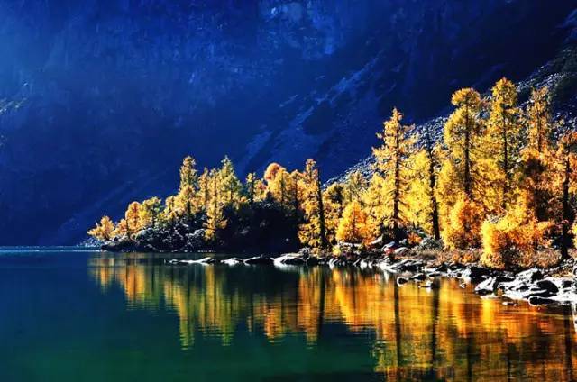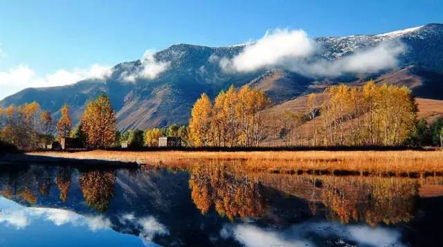 环抱高原海子的水草也由养眼的绿色向迷人的金色变化。各色的高原海子倒映着青黄相间的白桦林、皑皑雪山、藏族村寨,让人感到祥和而宁静。