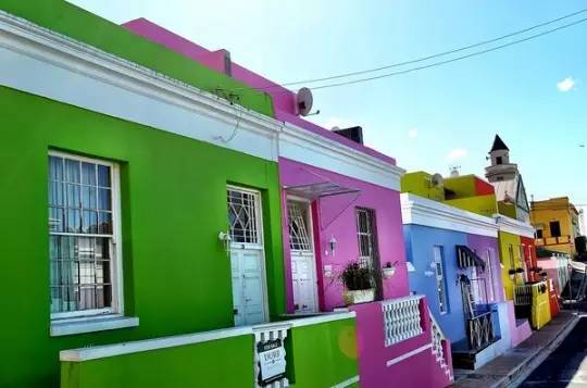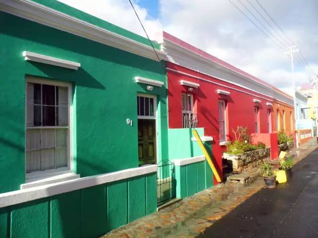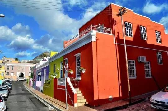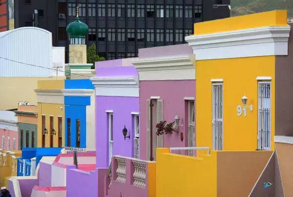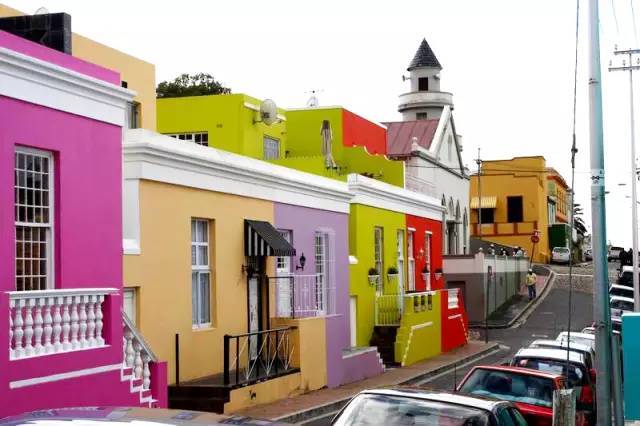 在南非的港口城市开普敦,有这样一片色彩非常艳丽房子,不是大红、翠绿、深紫,就是米黄、海蓝、亮橙……对比十分鲜明,而且几乎颜色没有重复。放眼望去,整个小镇色彩斑斓,十分亮眼。