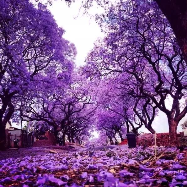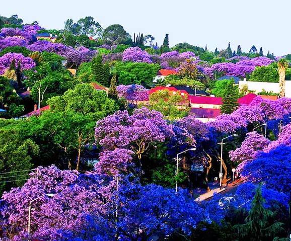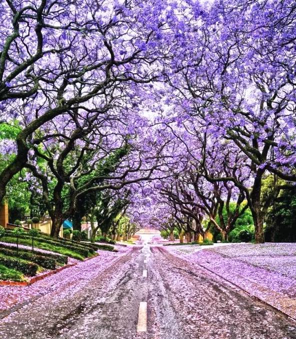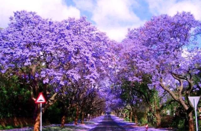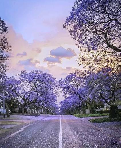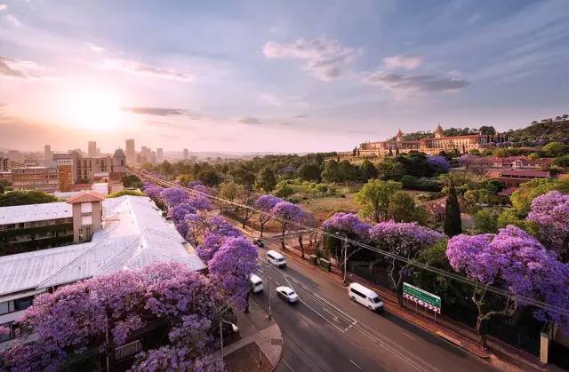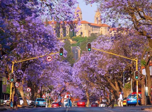 当下正值南非生机盎然的春天,这里也仿佛变成了紫色梦境。南非的许多城市都种植了一种名为“蓝花楹”(Jacaranda)的树,因为花朵是蓝紫色的,人们把它叫作“紫薇花”,其中最著名的观赏地就是南非的行政首都比勒陀利亚了。