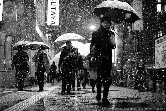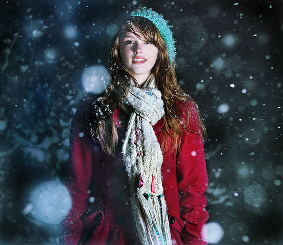晚上如果下着大雪,去拍张人像吧,不过记得开启你的闪光灯哦,这样会把镜头前的雪照亮,而由于闪光灯的亮度有限,背景就会自然暗下去。出来的照片会大不一样哦。