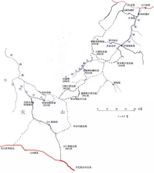 乌鲁木齐-白杨沟煤矿-白杨沟达坂-台普希马克河-库勒阿特藤达坂-蒙特开增达坂-喀纳尕依特达坂-哈尔嘎特郭勒沟-哈拉哈提达坂-探矿大本营-218国道