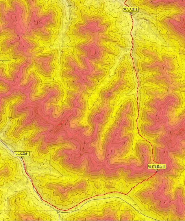 第七天:翻越哈尔哈提达坂,约需2小时。然后进入古仁格勒沟,到砖瓦房,约需1.5小时。到古仁格勒三孔水泥桥的C线徒步终点,还有8公里,大约3小时。