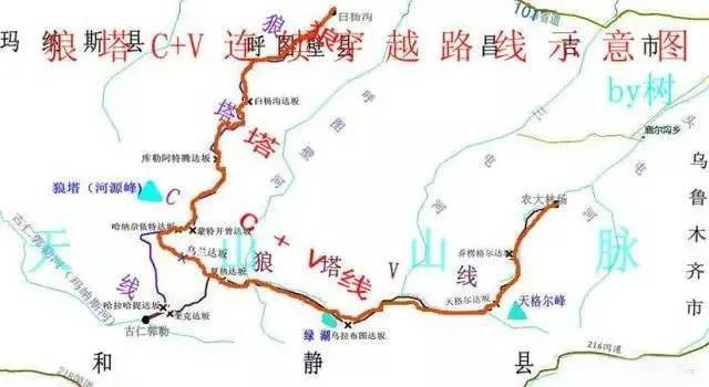 狼塔V线--狼塔v线是穿越中部天山地区的一条探险线路,2011年8月由是树、背包者、清风、公格尔和石头五人完成首次穿越。该线路从静县巴伦台启程,至昌吉市庙尔沟出山,横跨西天山中部四大河流源头,穿越天格尔山,全长120公里,徒步时间约需7天。