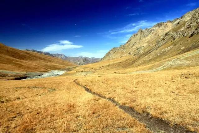 从乌拉达坂顶,顺着马道一路下坡,会经过一条300余米的碎石路,沿着河谷左侧下行。下达坂后,往三屯河岔口行进,达到后逆行而上。其间,途中需过河一两次,建议一路沿着右侧马道、栈道走,不行沿右手切上山,横切过去。全天海拔下降1600米。
