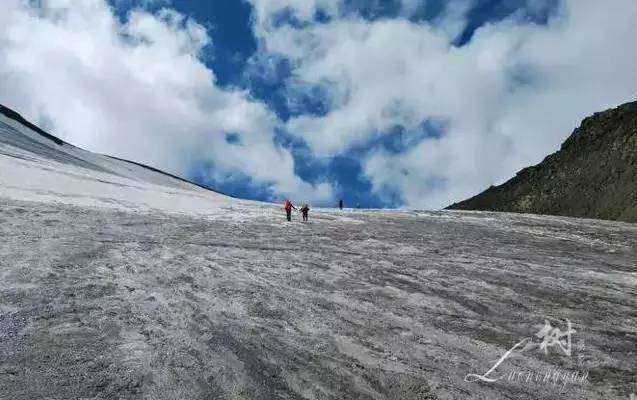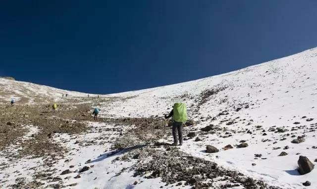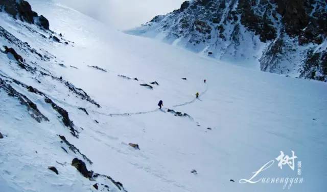图为冬季2月底的蒙特开曾冰达坂,积雪厚度约40cm,但不足以承受人的重量,爬升时需要先用力将跺出一个个雪窝,才敢把脚踩实,有时要高台脚连续猛跺三四次才能跺出一个雪坑,对穿越者的体能是个巨大的考验。图:@树