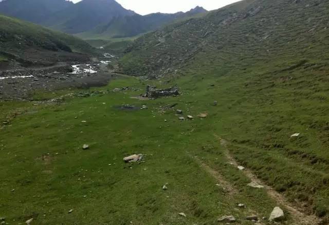 翻过白杨沟达坂垭口,走右边马道下山。先到一个小平台,继续沿右边下到一长了草的平台。路在此分为左右两条,左是狼“B”,右狼“C”。继续沿右下不久会看到马鞍形的山脊,沿着马道下到谷底的河边,过河后顺水流往下游走,前行不远叉路处上右边的马道。从马道上行至栈道,沿栈道转入台普希克马河谷的上方,就此进入了群狼的山谷。在达坂顶,可以看到河源峰。