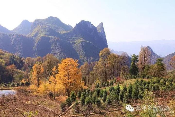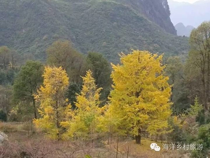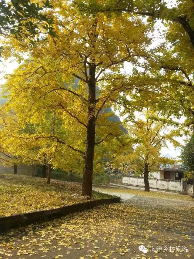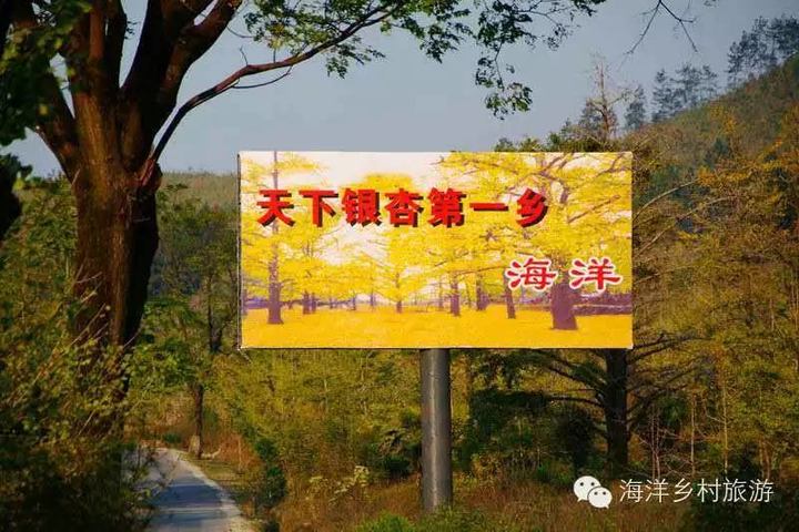 当你从桂林方向来到海洋乡的第一个村庄,公路两边已经陆续看到一株株的银杏树,说明你已经到了海洋的诸家村。几年前在公路边立着的海洋大招牌“天下银杏第一乡-海洋”现在已经更换。