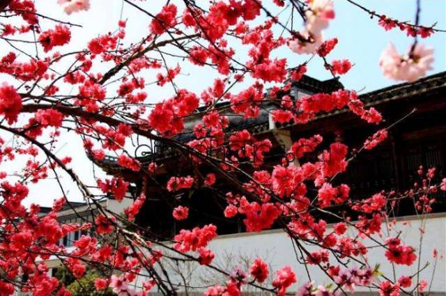 当姹紫嫣红的桃花盛放时,走在雄村的桃花坝上,暖暖的春风迎面吹,身边的桃花朵朵开,粉嫩的花瓣衬着白墙黑瓦,正是“满树和娇烂漫红,万枝丹彩灼春融”。