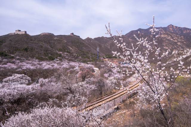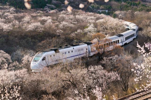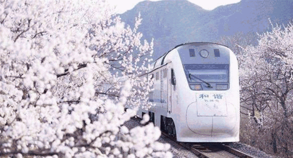 北京有一趟穿越居庸关的和谐号列车,铁路两旁及山间开满樱花,白色的列车如一条“长龙”,美到惊呆!