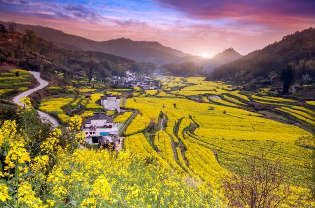 江西婺源被誉为“中国最美的乡村”,婺源最美的季节是油菜花开放的时候。每当春暖花开时,置身于万亩梯田中,黄灿灿的油菜花与远山、近水、粉墙、黛瓦相映成趣,构成一幅天人合一的画卷,在这里您可以尽情的释放,让心灵自由飞翔。