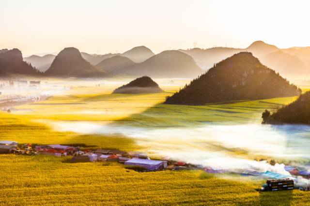 罗平油菜花,不着杂色,花色袭人。几丘田花开,鲜黄一片,迷了人眼。春风习习,金色的花海,潮起潮落,荡漾着清香,吹奏着牧歌。罗平城在花海中沉浮,成为一座大海中的岛屿。当你站在白腊山上俯视这座县城的时候,你会想到,这便是海市蜃楼。