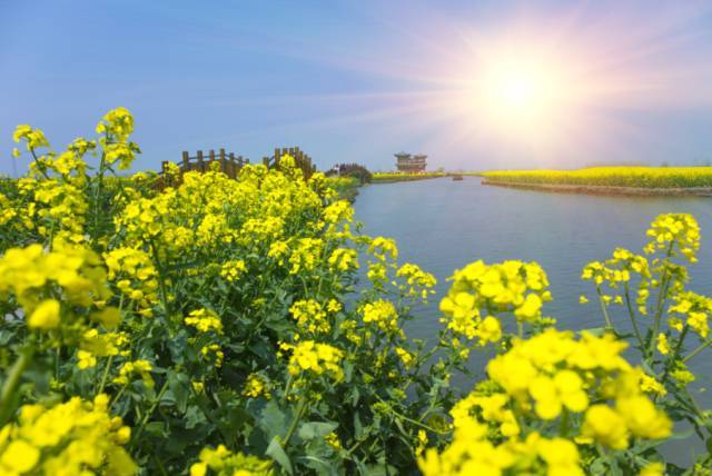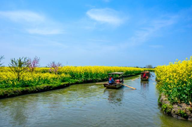 传说垛田是当年泰州知州岳飞大战金兵摆设的八卦阵。每当清明前后,油菜花开,蓝天、碧水、“金岛”织就了“河有万湾多碧水,田无一垛不黄花”的奇丽画面,兴化充满说不尽的柔情蜜意。乘木船顺流而下,从千百花垛田间缓缓划过,每一处的转角,都迷失在花田里。