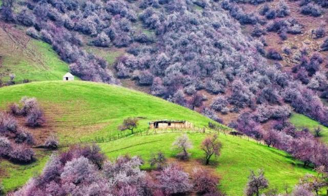 新疆吐尔根杏花沟 起伏绿地上跳动的红艳