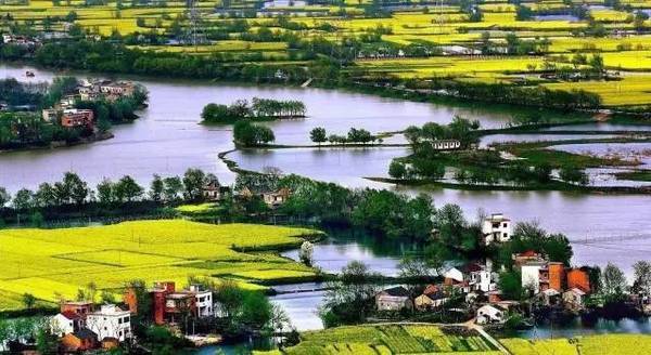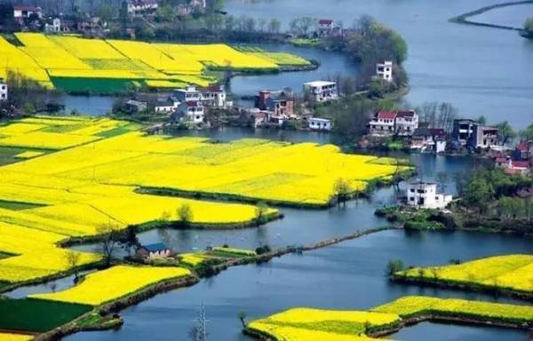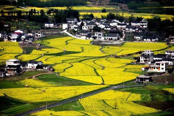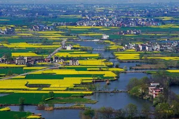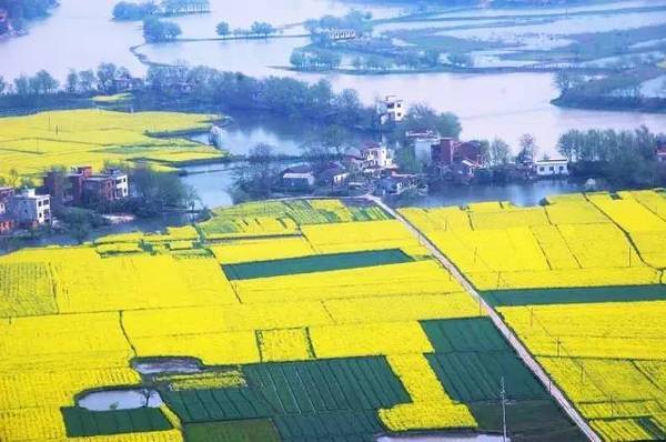 一排排房屋村舍,一块块农田相间,一片片油菜花连绵起伏,一物一景,交相呼应。