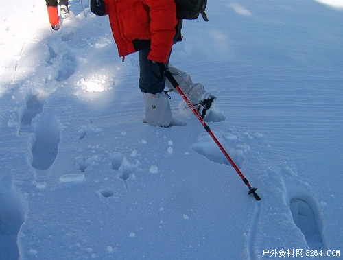 行走经验:在下雪时行走,或走在积雪时间较长的地上,最重要的是步幅要小且保持固定步调,靠自己的步伐有节奏地走。若胡乱加快速度,或步伐太大失去节奏常会造成疲乏。行走在雪地需不慌不忙,按照自己的步伐行进是很重要的。如果积雪仅到埋过鞋子的程度,几乎不影响到步伐,可如履平地般的行走,(日积雪高过膝盖时,仅仅是举步就相当耗费体力.疲劳困倦就更不用说了。若积雪深及腰部,就得用自己的脚和腰推开摆在眼前的雪,采取步步为营的走法即所谓“除雪前进的方法”,以尽量减轻疲劳,除雪前进的要诀是,将自己的身体(尤其是上半身)倾向前行方向,靠自己的重心和自己的体重推开雪往前进。若数人结队行走于膝盖以下程度积雪的雪地,脚步需与领头队员的脚印重叠前进,如此比三三两两凌乱地走,疲劳程度要来得低。走在柔软或积雪深的雪地,穿上雪地鞋就不怕脚会陷人雪中,且能轻松自在地走在雪地上。