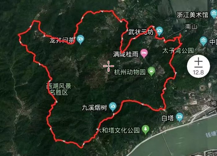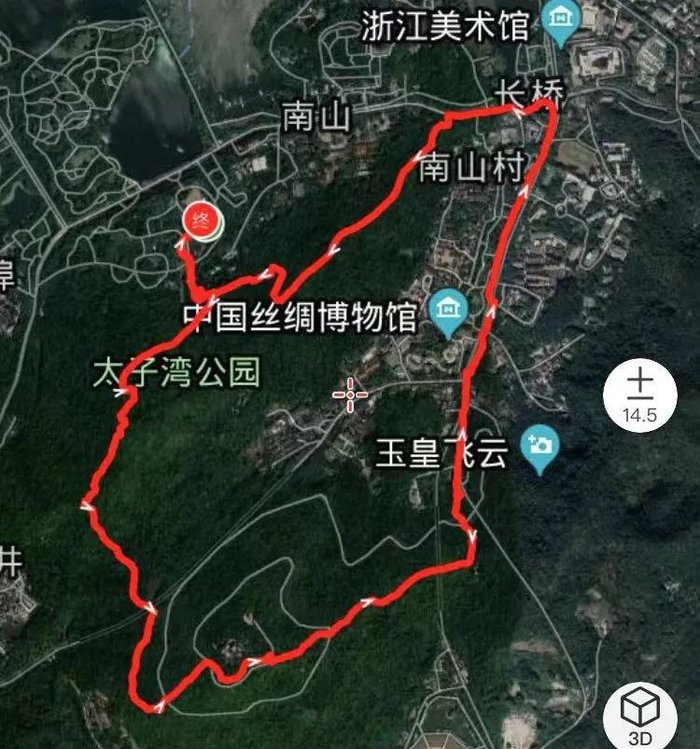 太子湾公园(起点:一号打卡点)—九曜山—玉皇山公园(二号打卡点)—玉皇山路—南屏山—太子湾公园(终点:三号打卡点)