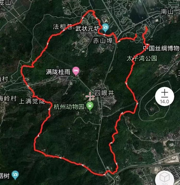 太子湾公园(起点:一号打卡点)—九曜山—丁婆岭—虎跑水厂(二号打卡点)—二龙山—满觉陇—南高峰—法相唐樟(三号打卡点)—三台云水—太子湾公园(终点:四号打卡点)