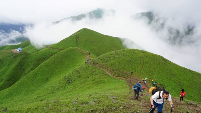 D2、5月28日8:00萍乡火车站集合,包车前往龙山村,早餐后,10:00上山,14:00抵达发云界,自备午餐(半小时),中餐完毕1:向武功山好汉坡进发,17:00抵达武发客栈看晚霞!住店,休整到次日。