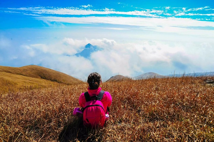 垭口缓冲较长,还有一些上上下下的起伏路,是考验意志力的路程,全程约6-8小时。这段风景是武功山的精华,山脉连绵不绝、气势磅礴,天很蓝,云很白,有