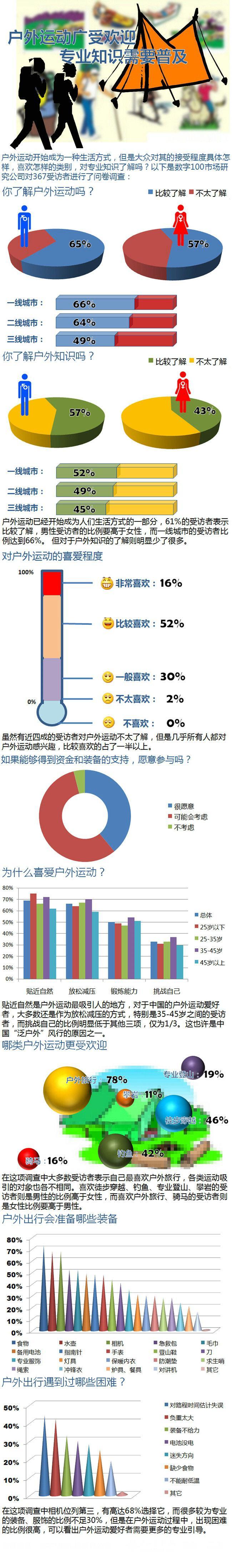 户外运动开始成为一种生活方式,但是大众对其的接受程度具体怎样,喜欢怎样的类别,对专业知识了解吗?以下是数字100市场研究公司对367受访者进行了问卷调查: