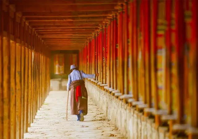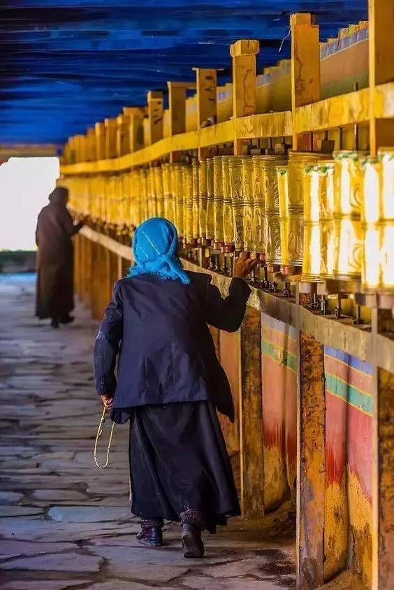 拉卜楞寺有一条环形的转经路,其中很长一段是转经廊,墙壁上安放着不计其数的转经筒。在这里你会看见通往甘南路上朝圣者们那善良的灵魂……