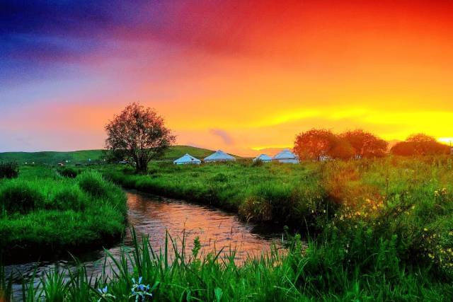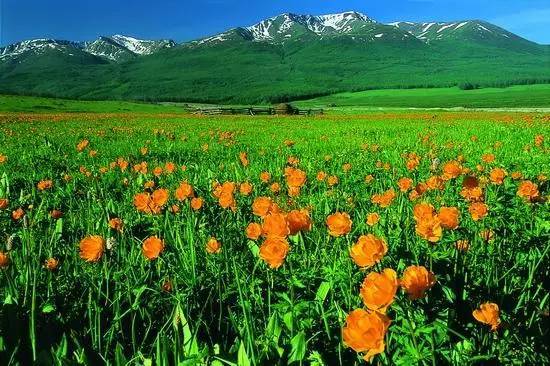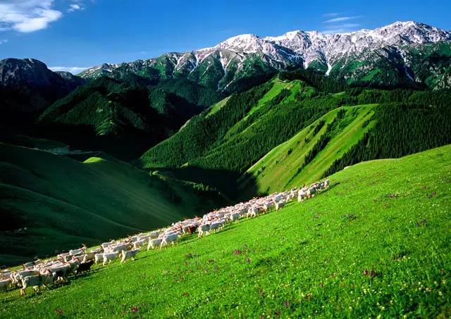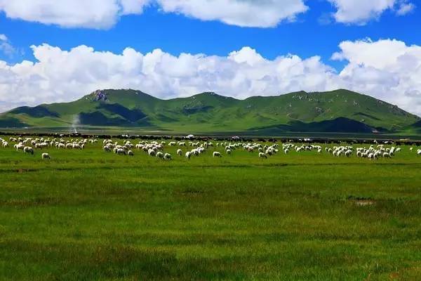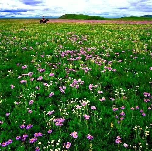 夏季,整个草原碧绿如茵,鲜花盛开,繁花似锦,牛羊遍野,蓝天、白云、绿草浑然一体。