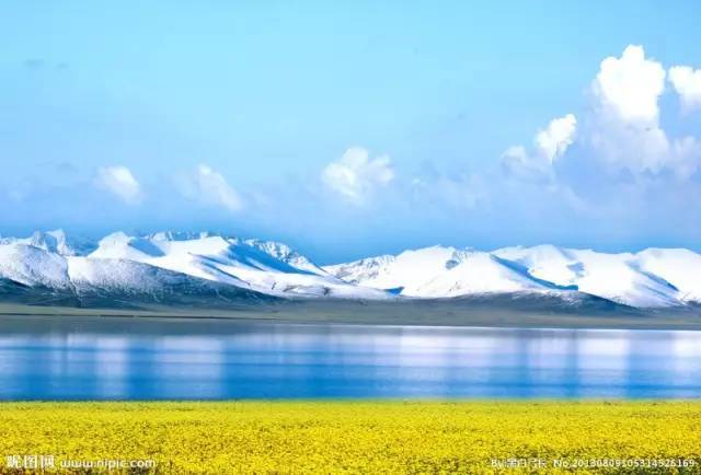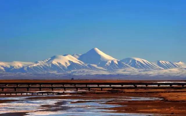 青藏铁路在措那湖畔贴身而过,湛蓝的湖水如同无暇翡翠般镶嵌在雪山之间。