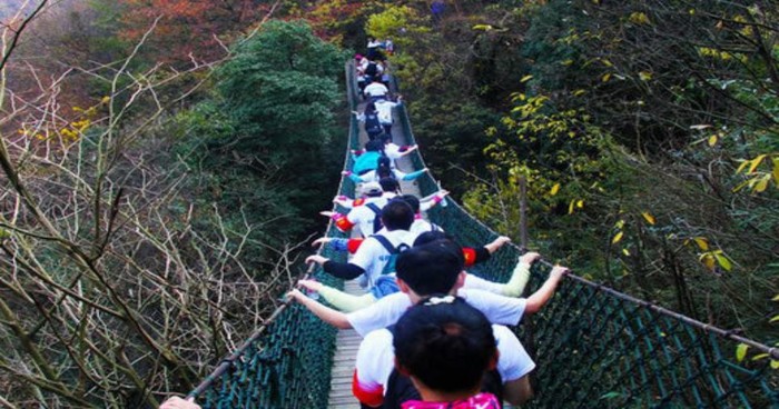 流云桥是一座跨在山谷之上的悬索吊桥,走在上面晃晃悠悠,胆大的朋友可以往下看,之前所见,只道是绿色葱荣,在这吊桥上,各种绿色尽收眼底,不禁感叹绿之驳杂。