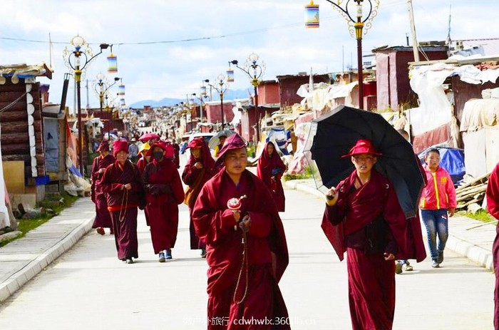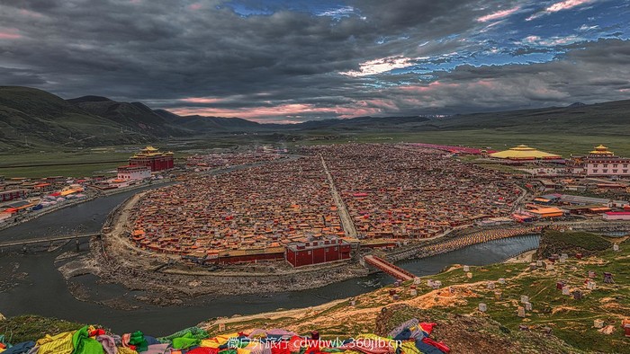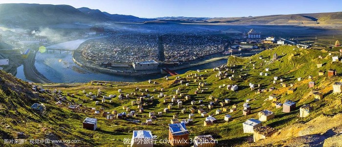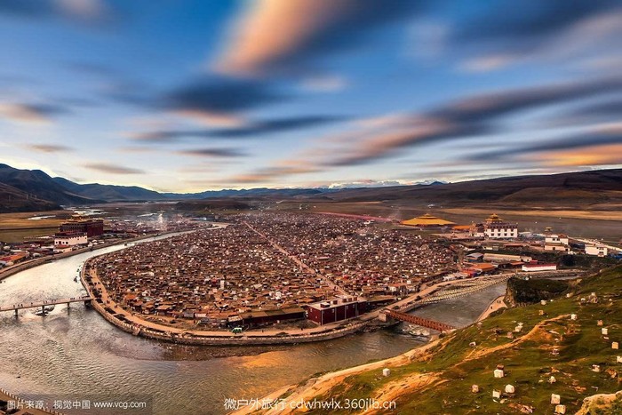 亚青寺建在四面环山的草原湿地上,有数千间信徒居住的小木屋,纵横交错的河流包围了整个寺庙的建筑群,每当清晨或黄昏,炊烟弥漫,河水闪耀着金光,颂经声随风远远传来,犹如天籁,动人心弦。