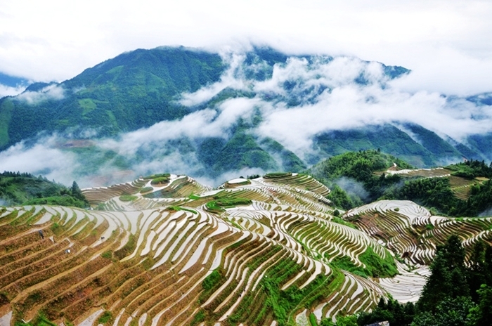 龙脊梯田——位于桂林市西北部的龙胜县和平乡境内,距县城22公里,距桂林市80公里。龙脊梯田建于明末,距今已有600年的历史。这里的梯田从山脚盘绕到山顶,高低错落,线条优美,如练似带。这里一年四季景观各异,春天锦绣田园,风景如画;夏天绿波滚滚,景色迷人;秋天金黄灿灿,多姿多彩;冬天银装素裹,分外妖娆。这里还居住着壮、瑶、侗等少数民族,游客可以领略少数民族特有的民居,民俗。如果您喜欢唱山歌,少数民族歌手还可以与您对唱,一比高低。