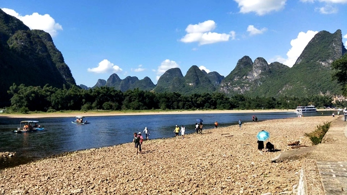 09:00左右开始从九马画山徒步漓江,沿途欣赏漓江美景,还可以捡漂亮的石头回去做纪念哦。途中会经过20元人民币的观景台,可以准备20元人民币拿在手里对比拍照哦。