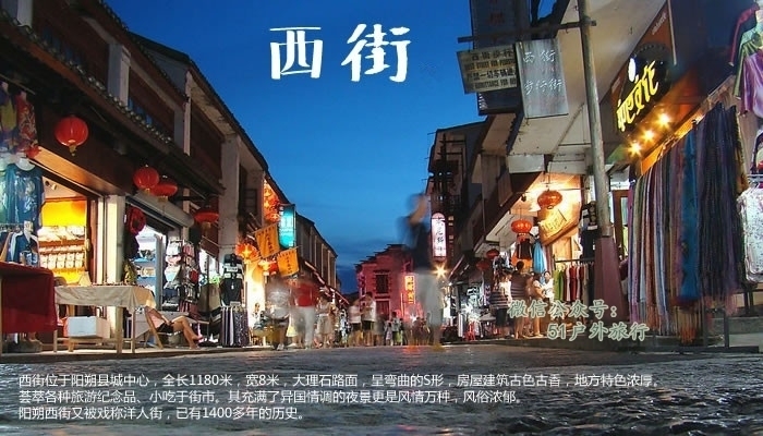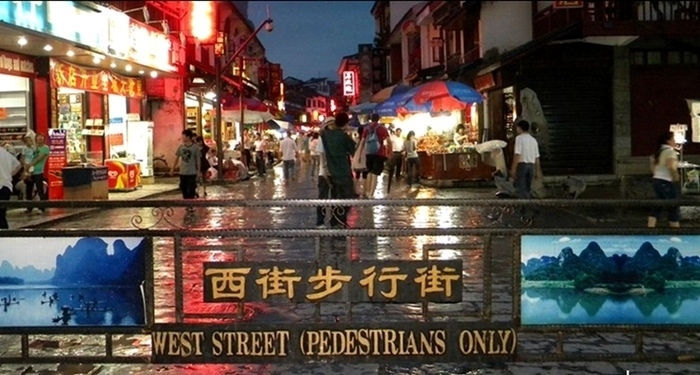 阳朔西街又被戏称洋人街。不到1公里的阳朔西街,由石板砌成,呈弯曲的S形。街上摆满了各种旅游纪念品。西街是外国人在中国最密集的一条街,每年来这里居住休闲游的外国人相当于这里常住人口的三倍。西街是全中国最大的外语角,其涉外婚姻比例之高为全中国之最。为此,旅游界专家、学者称之为“中国旅游业中的阳朔现象”,中国的“地球村”。这种现象引起中国人的关注,世界的关注。其充满了异国情调的夜景更是风情万种。