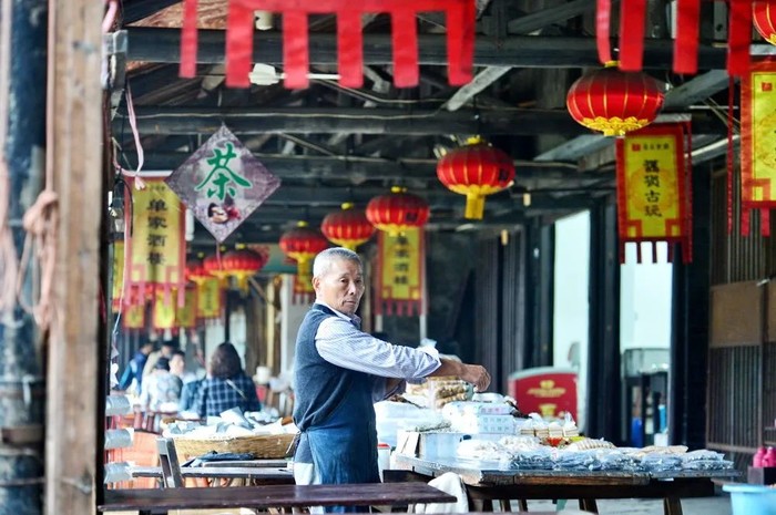 沿河的长廊,黛瓦木廊柱石板街,家家门口摆了桌椅,有茶位,有杂货,有小食店。