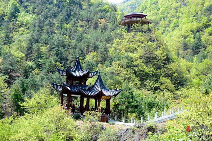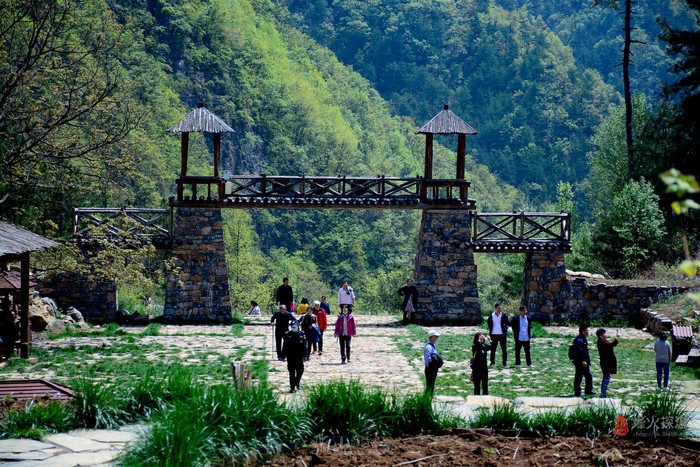 看似谦恭虚姿、平缓无奇的两山,形成的峡谷却窄而险峻,陡峭崖壁如刀削斧劈般仞立于丈许两岸,壁上石突景倾,颇为壮观。谷中卵石叠连,石间清水暗流,顶上青藤遮掩,形成了幽深天然的绿色走廊。幽谷中,最为惊险的是一夫当关、万夫莫开的龙门关。数百米峡谷,两边是刀削斧劈般的万丈陡崖,窄处只容一人攀援而过。走在独木搭起的栈道上,闻听石崖上滴嗒的水注声、暗河的流水声、绿顶上的鸟鸣声,有惊无险,累而愉悦。过了龙门关,进入龙门峡,只见树木和石崖,难见天日和阳光。