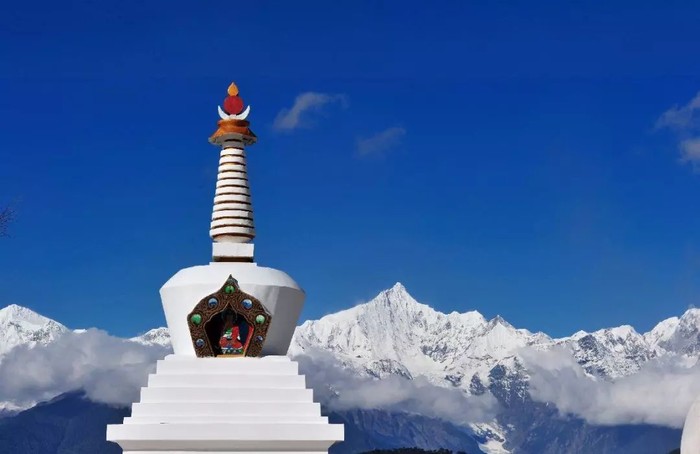 梅里雪山主峰说拉曾归面峰,为藏传佛教宁玛派分支伽居巴的保护神。峰型有如一座雄壮高耸的金字塔,时隐时现的云海更为雪山披上了一层神秘的面纱。