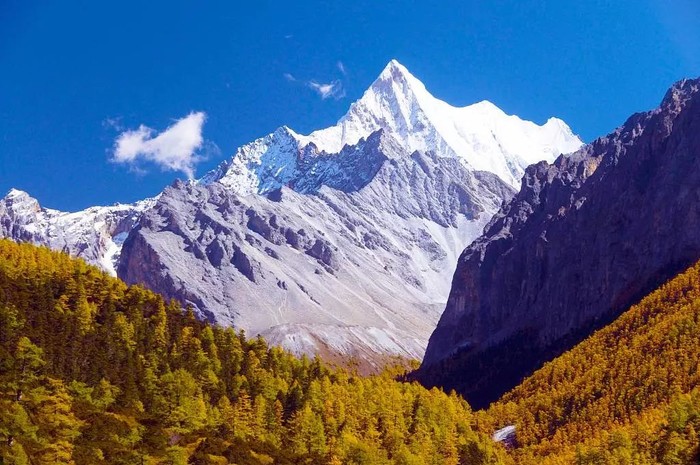 远处是雪山,在清明的秋空里,极高、极白、极远。在这种高远雄奇的峰峦之下,林海尽为秋色所染,红、黄、绿层次井然,特别是那如火如霞的红色秋叶,像雪山的灵魂,尽情地展现着多情的姿态,让人深悟深林高山的豪爽热烈。长满灌木林的草甸草坡上雪茶点布;若陷若现的流水在海中穿行,仿佛雪山之魂。