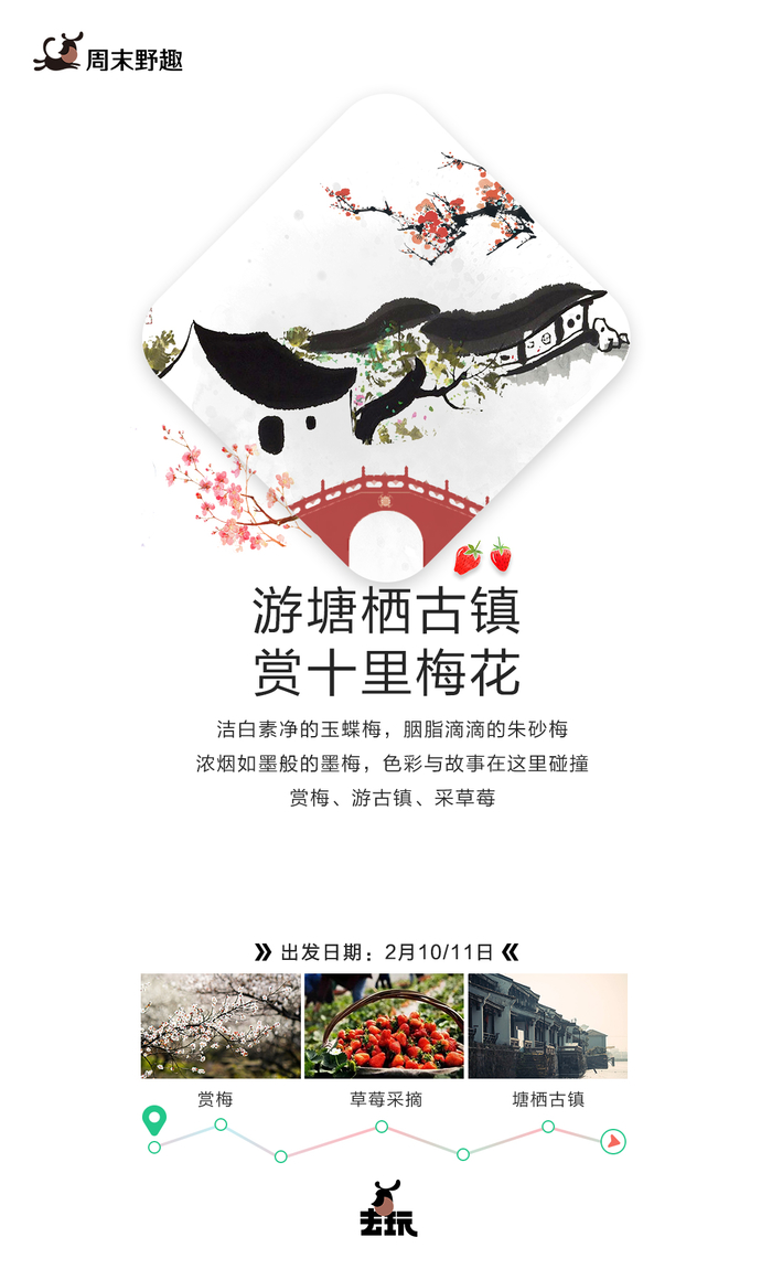 入门级户外线路,好路行走无负担,休闲活动,赏梅,游古镇,采草莓。