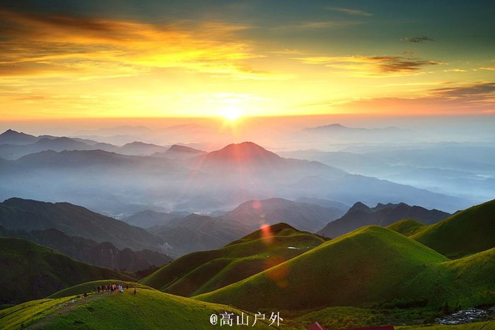 早起的人可以看看日出,武功山的日出非常有名,天边多彩云霞,古人称之为“晨晓”,是武功山金顶日出前十分壮美的景观。日出之后,金光灿烂,金色的阳光打在草地上,泛起淡淡的金黄,四周翻腾的云海变幻着色彩。