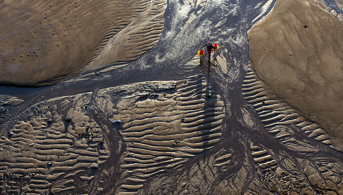 东壁村前是个港湾,湾中停满归舟,披着夕阳的金黄色光芒,在蔚蓝色海上轻悠地摇晃,一派温馨静寂的渔歌唱晚风光。偶站立的濒海小山和对面的礁石山脉,因海浪长年冲刷,山岩裸露,巨石乱叠,礁盘隆起,石质粗砺,却将海湾合抱起来。正值退潮,就在山脚与海的交界处,平坦的沙滩,突然亮出硕大的弯钩形状,仿佛是个巨大的钓钩,在西照阳光的折射下,闪烁着迷人的光,在诱惑摄影爱好者“愿者上钩哦!”,于是又谋杀了忒多的菲林。