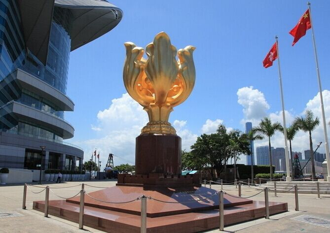 香港金紫荆广场(英语:Golden Bauhinia Square)位于香港湾 仔香港会议展览中心新翼人工岛上的东北部,三面被维港包围,在维港的中心位置,与对岸的尖沙咀对峙,临近湾仔临时海滨花园及维多利亚港,是博览海滨花园的 一部分,也是香港观景的好地方。1997年7月1日香港特别行政区成立,中央政府把一座金紫荆铜像赠送香港,这座高6米的铜像正式名称为“永远盛开的紫荆 花”,寓意香港永远繁荣昌盛,近年来成为部分中国内地旅客的必到香港旅游景点之一。