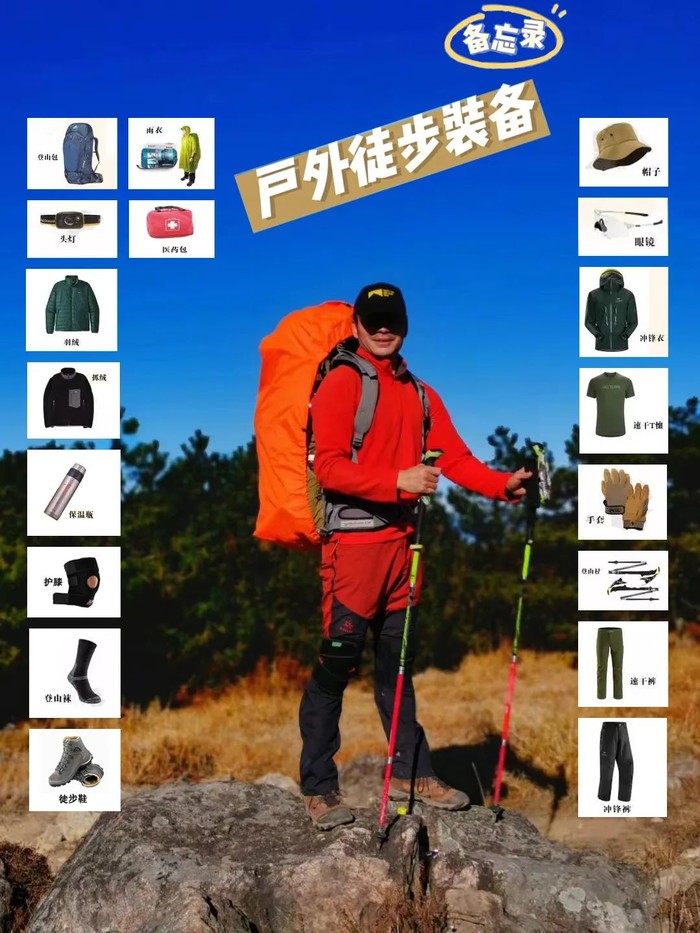 2、推荐装备:身份证,徒步鞋、护膝(保护膝盖,良好的意识至关重要,建议)登山杖,雨披,头灯,相机。