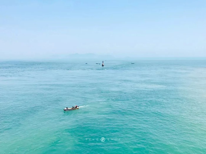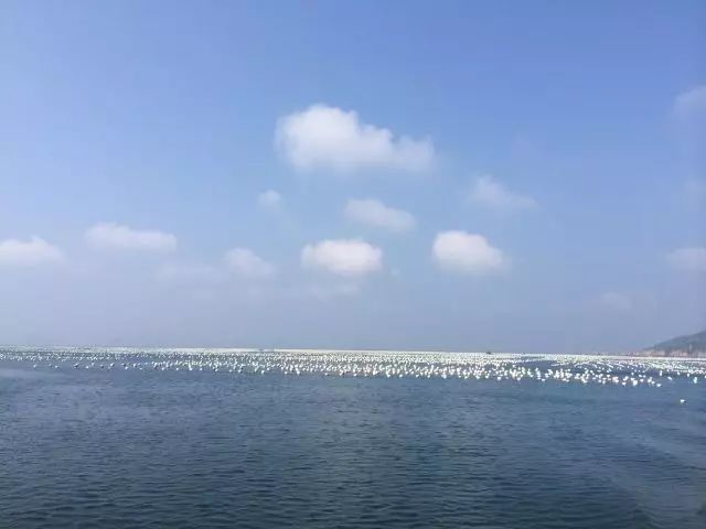 下游轮不远处的海上牧场,这里的海水淸澈,蓝天碧波,水天相连,养殖贻贝的白色浮子在阳光照耀下闪烁、发光。渔舟碧波荡漾,一幅美丽的海上牧场画面。虽然正值正午,但我依然乐此不疲,拍个不停。