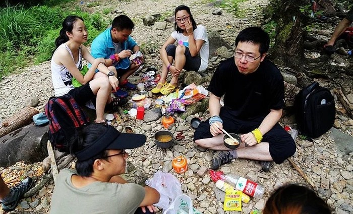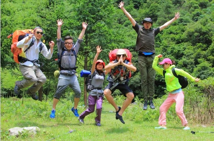 经过5个小时的跋涉,中午在龙凤瀑下端午餐,后从另一小路绕到瀑布末端后继续前进至周坑口营地。