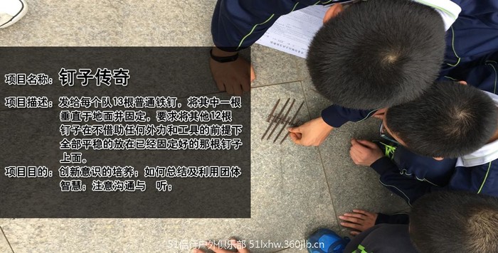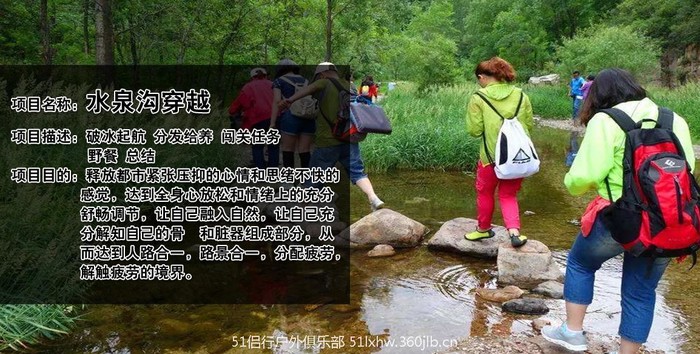 在徒步过程中,让参与者应对挑战,实现“磨练意志,陶冶情操,完善自我,熔炼团队”的活动宗旨!耐力与坚持力的考验,“挑战自我,熔炼团队”。 心态调整过程 野外宿营利用崇山峻岭、翰海大川等自然环境,通过精心设计的活动,亲近大自然,缓解压力,放松心情。达到“磨练意志、陶冶情操、完善人格、熔炼团队”的目的。释放压力的过程
