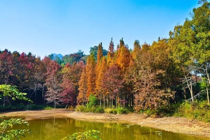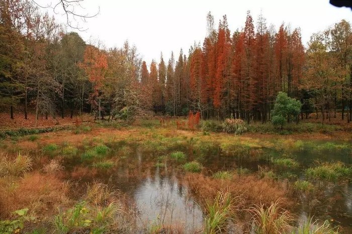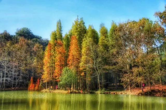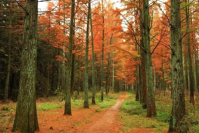 下午 进入宽大松软的防火道,开始登山。我们走的防火道,是软软的松林土道,特别有感觉。一路向上,穿过优雅的丛林,清脆的竹林,进入长乐林场红叶区。一路醉人的秋色啊:金黄的银杏、火红的红杉、斑斓的枫香,以及铺满地的秋叶,把这里装点得犹如童话世界。休闲组可环湖直接进入林场红叶区休闲玩乐,最后湖边大草坪和户外组汇合。